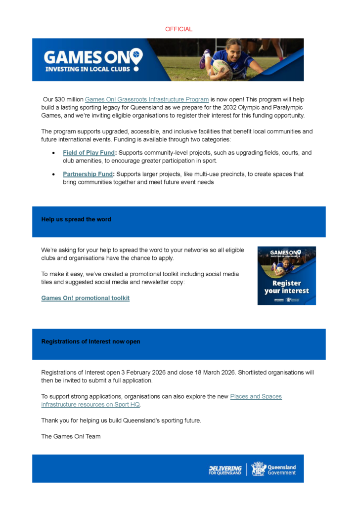 Games On! $30 million Grassroots Infrastructure Program is now open! This program will help build a lasting sporting legacy for Queensland as we prepare for the 2032 Olympic and Paralympic Games, and we’re inviting eligible organisations to register their interest for this funding opportunity. The program supports upgraded, accessible, and inclusive facilities that benefit local communities and future international events. Funding is available through two categories: